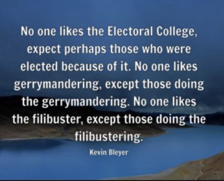 “Another is the U.S. Senate, which gives vast overrepresentation to sparsely populated states like Vermont and Wyoming and the Dakotas. It has repeatedly allowed the party that wins fewer votes to win control of the Senate. In addition, the filibuster is a super-majority rule; you need, in effect, 60 votes to pass legislation in the Senate.”
