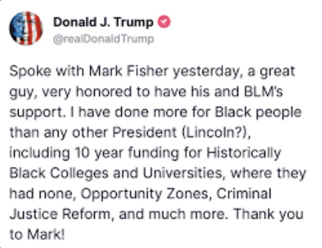 In a Truth Social post last month in which he wrote that he had “done more for Black people than any other President,” Trump wrote that he was proud to have the backing of an individual who purported to be a leading member of a Black Lives Matter chapter in Rhode Island. Trump wrote that he had spoken to the man, Mark Fisher, and that he was “very honored to have his and BLM’s support.”