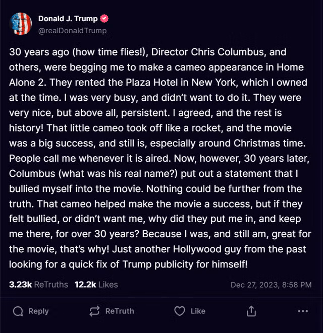 So this 3-year-old interview of “Home Alone” Director Chris Columbus somehow just caught the attention of Donald Trump. Of course, the narcissist couldn’t just ignore Columbus’ recount of the situation, his ego just wouldn’t allow it. Even though Columbus gave Trump somewhat of a compliment, Donald couldn’t leave well enough alone. So not only did Trump deny the fact that he bullied his way into his cameo. He then suggested the movie’s success was due in part because of his lone scene.