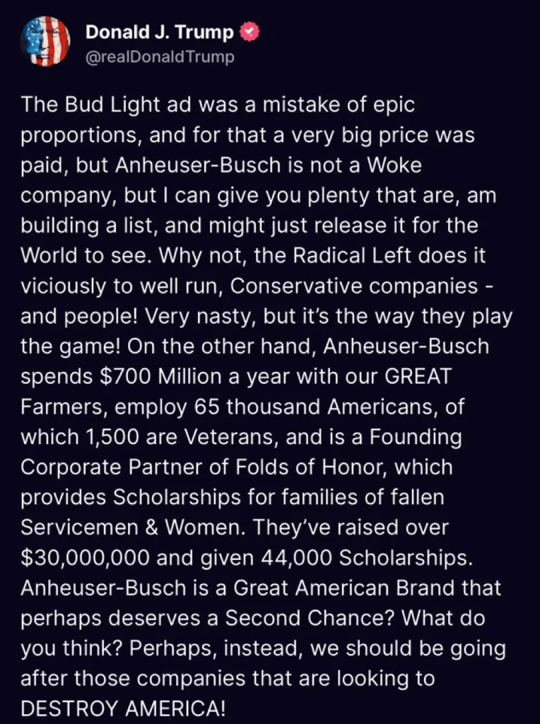 Trump’s post on Truth Social represents a major attempt at deescalation in a long-simmering feud between the political movement the former president leads and the mega corporation since April 2023, when it came under fire for a sponsored post with a transgender influencer.