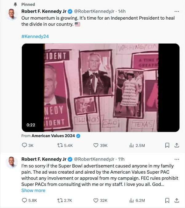 His Super Bowl commercial is an exact rip-off of his beloved uncle, President John F. Kennedy. The Kennedy family has been very vocal about their concerns regarding RFK Jr’s campaign. Nearly all members of the Kennedy clan have publicly expressed their support for President Joe Biden. They’ve been adamant that what RFK Jr stands for doesn’t coincide with the values of the Democratic legends his father and uncles stood for. His wild conspiracy theories and anti-vax rhetoric have further undermined the scientific community’s attempt to educate the masses. He’s used misinformation to politically capitalize upon the divisive narratives flooding the internet.