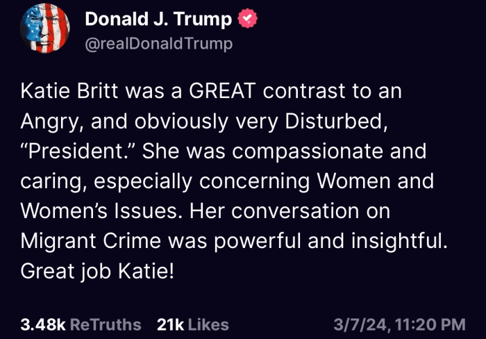 What did Trump think? Well, Trump is pretty heavily invested in Britt. He had endorsed MAGA Mo Brooks for Senate after he gave his fiery speech on J6 where he wore a bullet proof vest and told people in the crowd to start “kicking ass” right before they attacked cops. But then Brooks committed the cardinal sin at a Trump rally by suggesting that it was time to “move on” and stop obsessing over the 2020 election. That was it for Brooks, as Trump abandoned him and flipped his endorsement to Britt, who went on to win. Naturally, Trump loved the speech.”