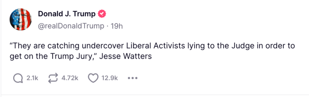 At Fox News, host Jesse Watters has launched attacks on the jurors, saying at one point that any juror who says they can be unbiased in the case is a liar, and citing Trump’s legal team as having uncovered potential jurors who were “undercover activists.” Trump himself quickly amplified Watters’ remarks (and as Lawrence O’Donnell noted, partially altering Watters’ quote) on Truth Social — an action that risks violating Judge Juan Merchan’s gag order prohibiting attacks on jurors, potential witnesses and other people related to the case. A prosecutor in the case reportedly called his remarkdisturbing while saying that Trump did, in fact, violate the gag order.