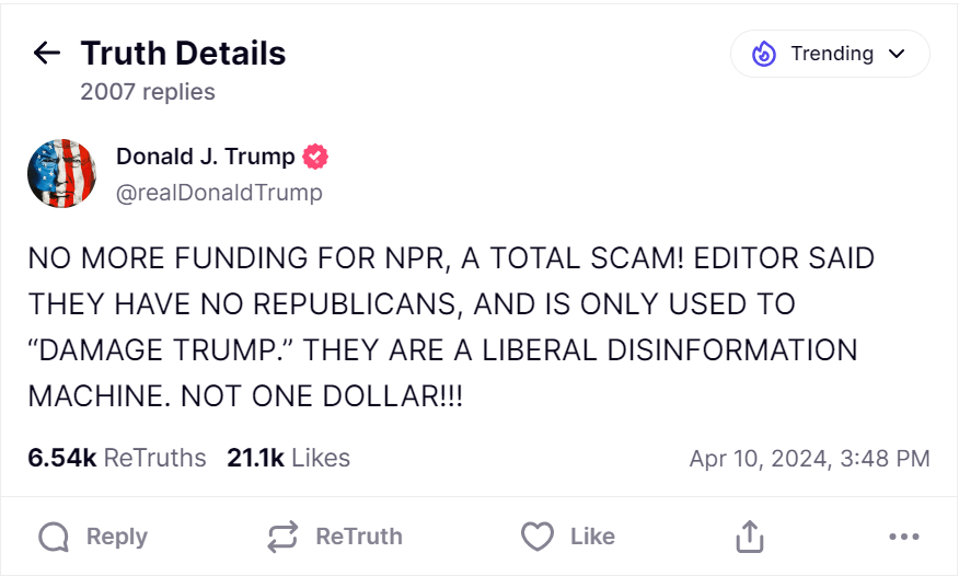 Today’s entry on the MAGA extremist “bucket list” is completely defunding Public media organizations NPR (National Public Radio) and PBS (Public Broadcasting Service). These faux-conservative, fascist-wannabes have their sights set on removing anything from the airwaves that doesn’t align with their propaganda. What better place to start, than publicly funded communication networks. That educates the masses by contrasting right-wing disinformation plastered across the alt-right media platforms.