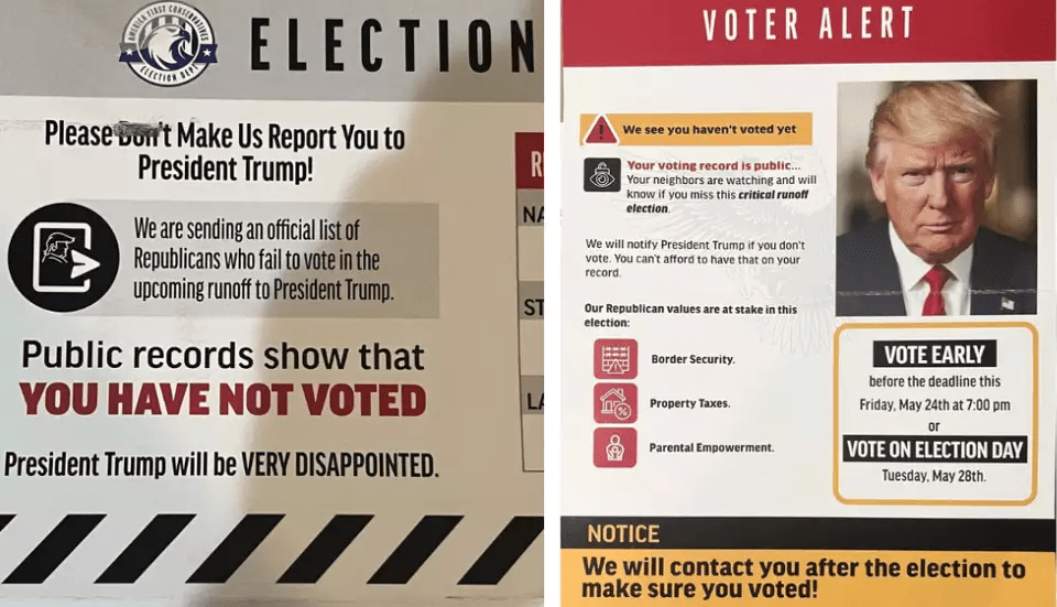 “Your voting record is public… Your neighbors are watching and will know if you miss this critical runoff election. We will notify President Trump if you don’t vote. You can’t afford to have that on your record,” reads one side of the mailer. On the other side, the mailer states, “Please don’t make us report you to President Trump” and that “President Trump will be VERY DISAPPOINTED.”