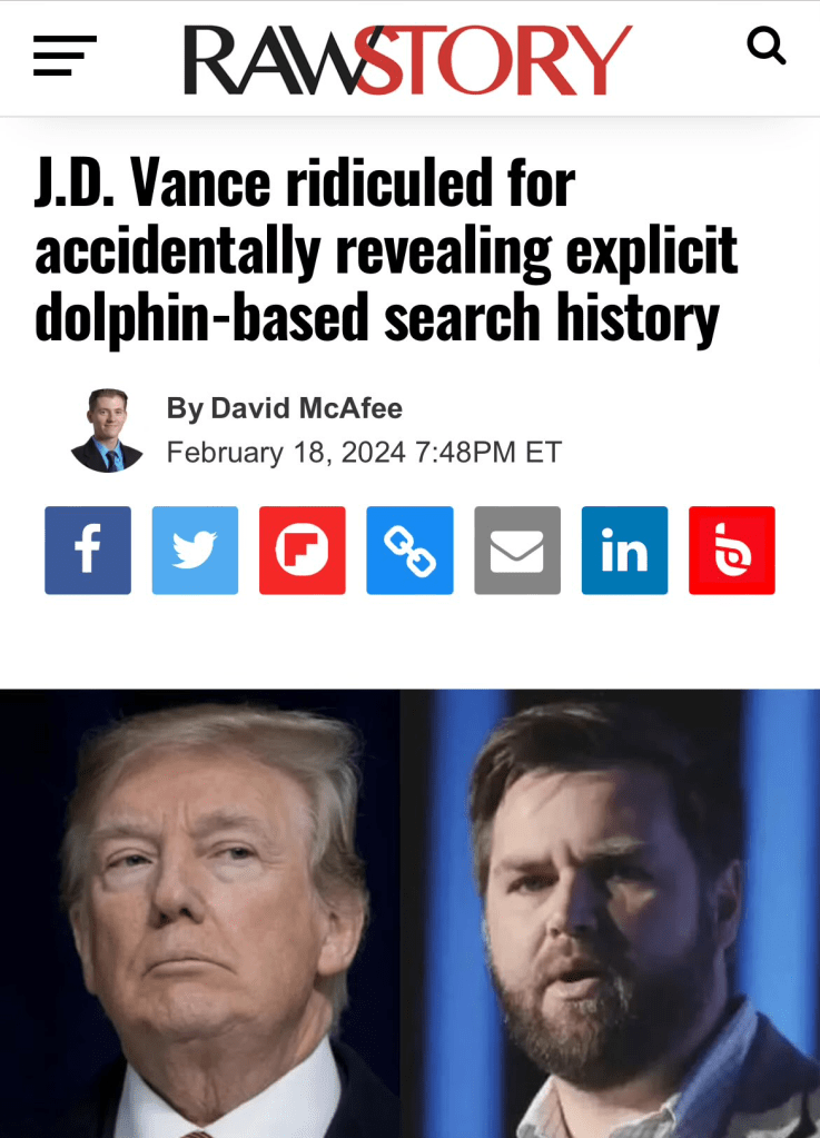 Now it’s come to light that Vance posted on X a video of a woman being romantically ridden by a dolphin back in February. No not a woman riding a dolphin which lots of egotistical white people love to do. By paying exorbitant amounts of money on their dream Caribbean vacation to appease their bucket list. Simply to chase the dopamine intoxication they rely upon to survive, from the social media likes it yields. No this was straight-up graphic doggy dolphin-style pornography. Something Vance pretended to stumble across while wandering through the uncharted waters of the interweb. But upon further review, it appears there was nothing random about his nautical bestiality discovery. As Vance’s own search criteria were revealed to be “woman/dolphin”.