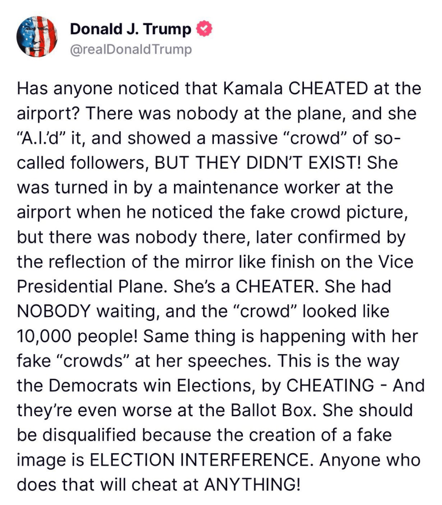 (CEO)—With Trump’s emo-esque pre-teen-tantrums reaching goth-like: “There’s no joy left in this cruel world!” emotional status. With his continued middle-of-the-night marathon bitch and moan sessions getting increasingly overdramatic. One meltdown of Trump’s in particular has stood out amongst the rest. He falsely accused Kamala Harris of using AI technology to generate fake adoring crowds awaiting her arrival. The main issue with this fabricated grievance of Trump’s. Is, that it’s clearly a projection of, what Trump’s campaign has been doing for a while now. To quote my favorite ant-marijuana public service announcements from the 80’s…