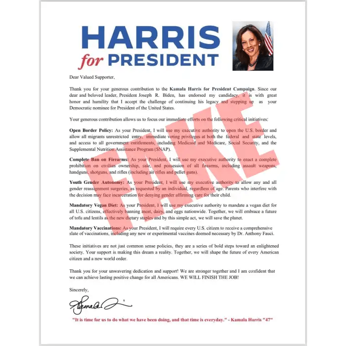 Also Included Inside Is A Thank You Letter Listing Fraudulent Policy Proposals Like Granting Voting Rights To Undocumented Immigrants, Banning All Guns, And Mandatory Vegan Diets Banning Meat, Dairy, And Eggs Nationwide