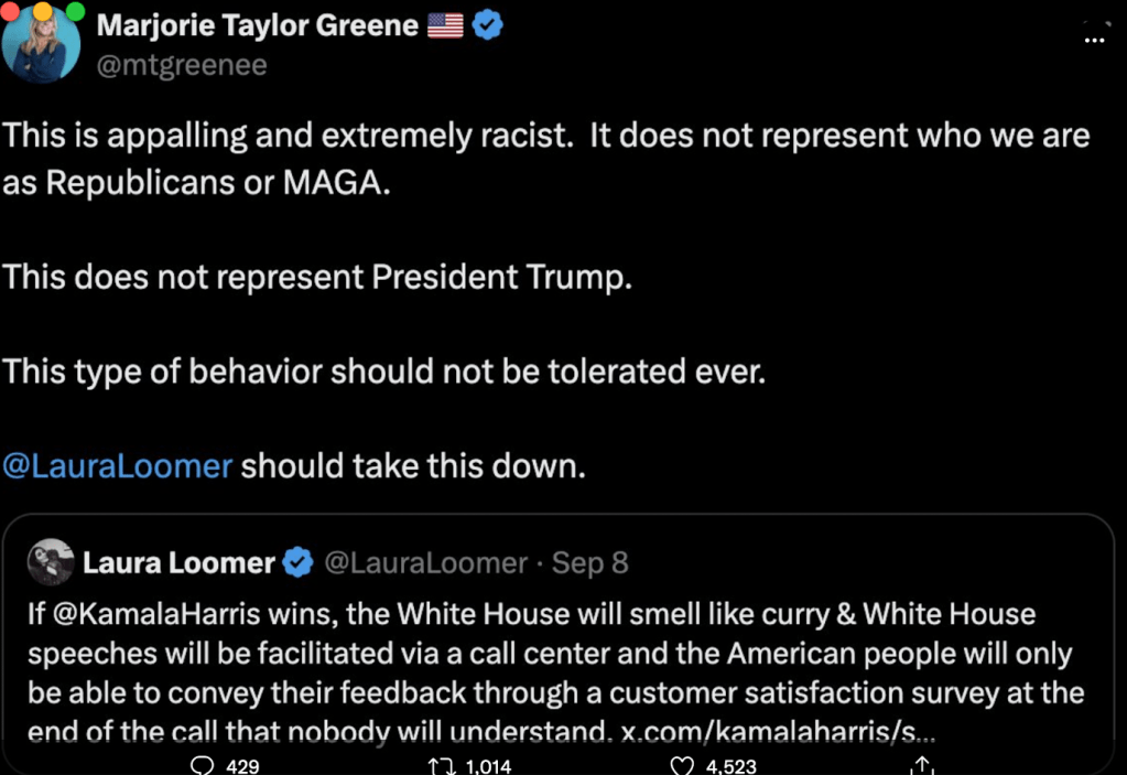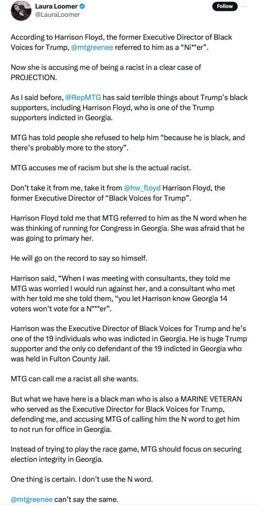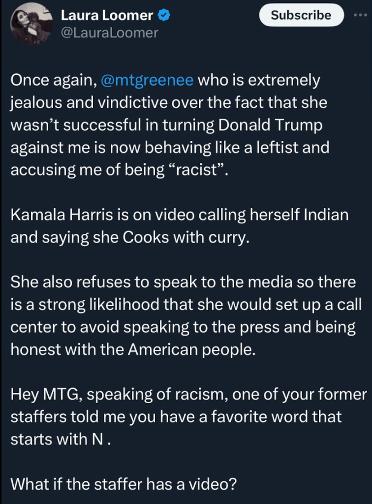 Then In What Can Only Be Described As A Fit Of Hypocritical Jealousy Marjorie Taylor Greene Went After Loomer For Her Racist Remarks About Kamala Harris…Which Begs The Question Since When Did MTG Give A Flying F*ck About Harris??….Or Racism??