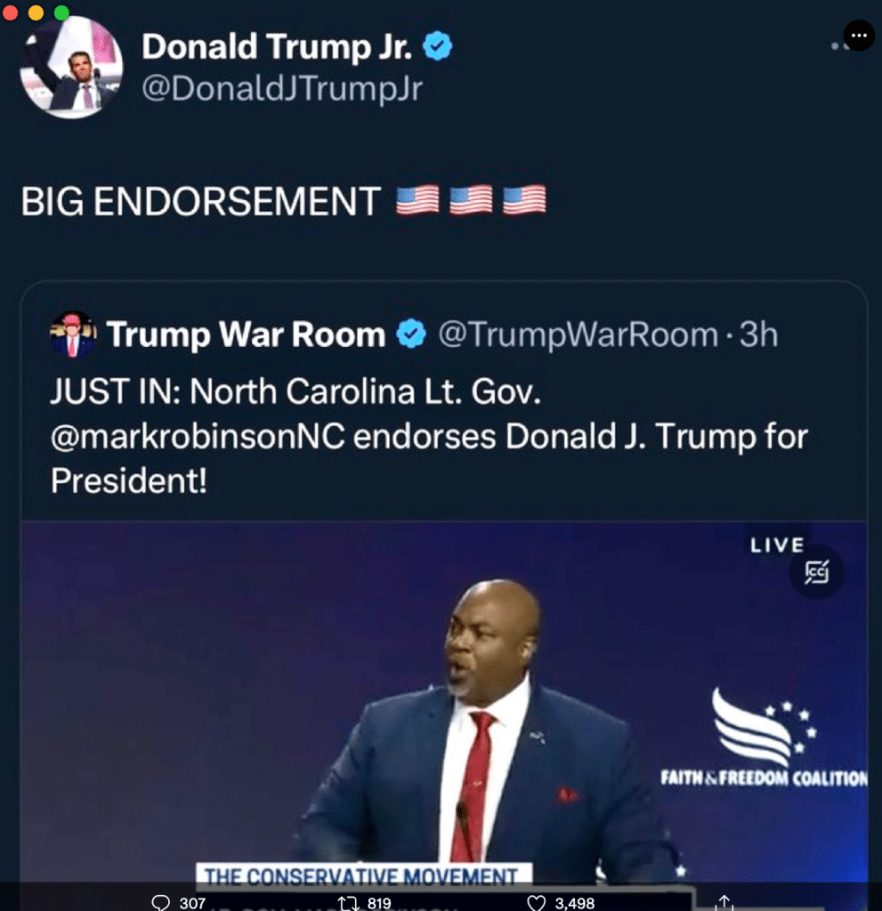 Robinson who once vowed to ban all abortions in North Carolina and said he wouldn’t allow for exceptions in instances of rape or incest. If that policy stance wasn’t extreme enough for the Lt Governor. He also labeled women seeking abortions after only 24 hours as “murderers”. Meanwhile, this barbaric assessment of women’s reproductive care is coming from the same guy who paid for his own girlfriend’s (Now wife) abortion. Back when they first started dating. A man so reprehensible the only thing you might consider entrusting him with is your brand-new Hezbollah pager courtesy of the Mossad.
