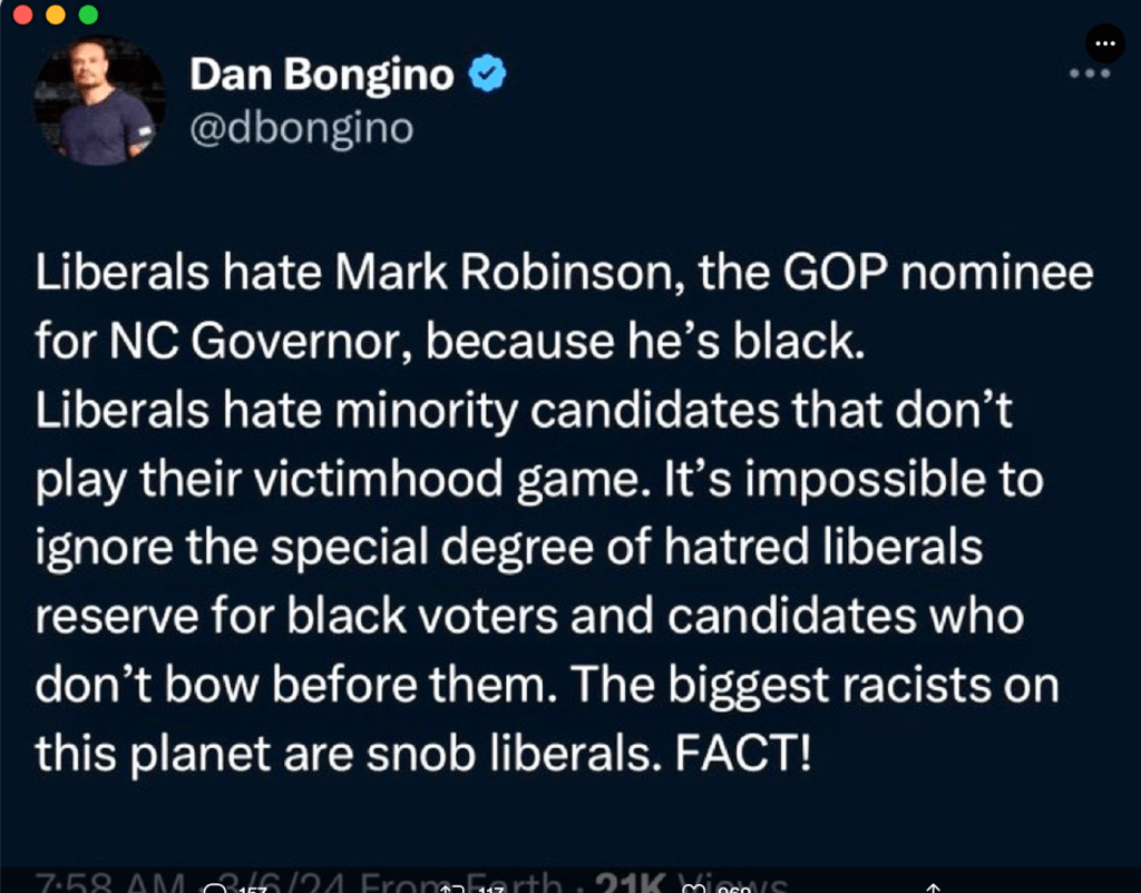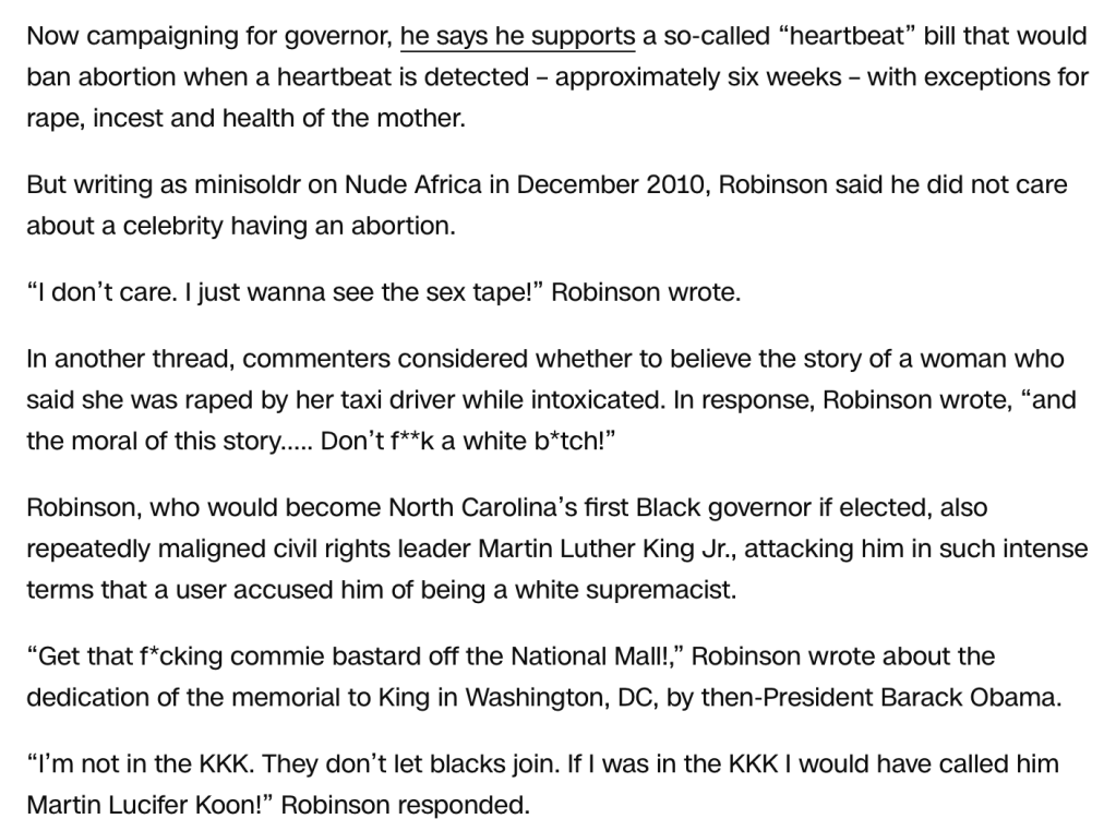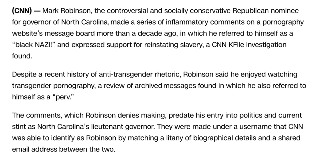 When being a self-described pervert is the most complimentary thing that can be said about Mark Robinson it speaks volumes. As a devout antisemite and anti-Muslim basher, he has a lengthy laundry list of character flaws. That reads like the 920 pages of “Project 2025” and includes Holocaust denialism. However, by today’s MAGA party standards, Robinson’s history of bigotry gained him the title “Better than Martin Luther King Jr” and “Martin Luther King on steroids” by Donald Trump. That might just be the most horrifying thing Trump’s ever said. That is saying a lot for a guy who routinely quotes Hitler and refers to fallen soldiers as “suckers” and “losers”. The point is, Robinson like Trump is clearly unfit to hold any political office, and yet these are somehow the best candidates MAGA has to offer.