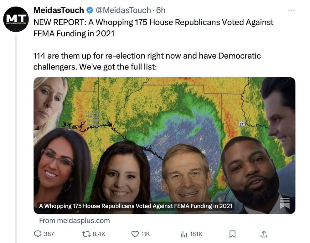 Unlike All The MAGA Republicans Who Routinely Vote Against Funding FEMA… Yet Always Take The Undeserved Credit For Federal Responses To Disasters