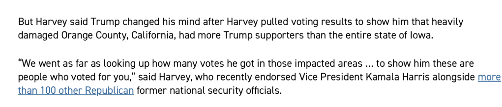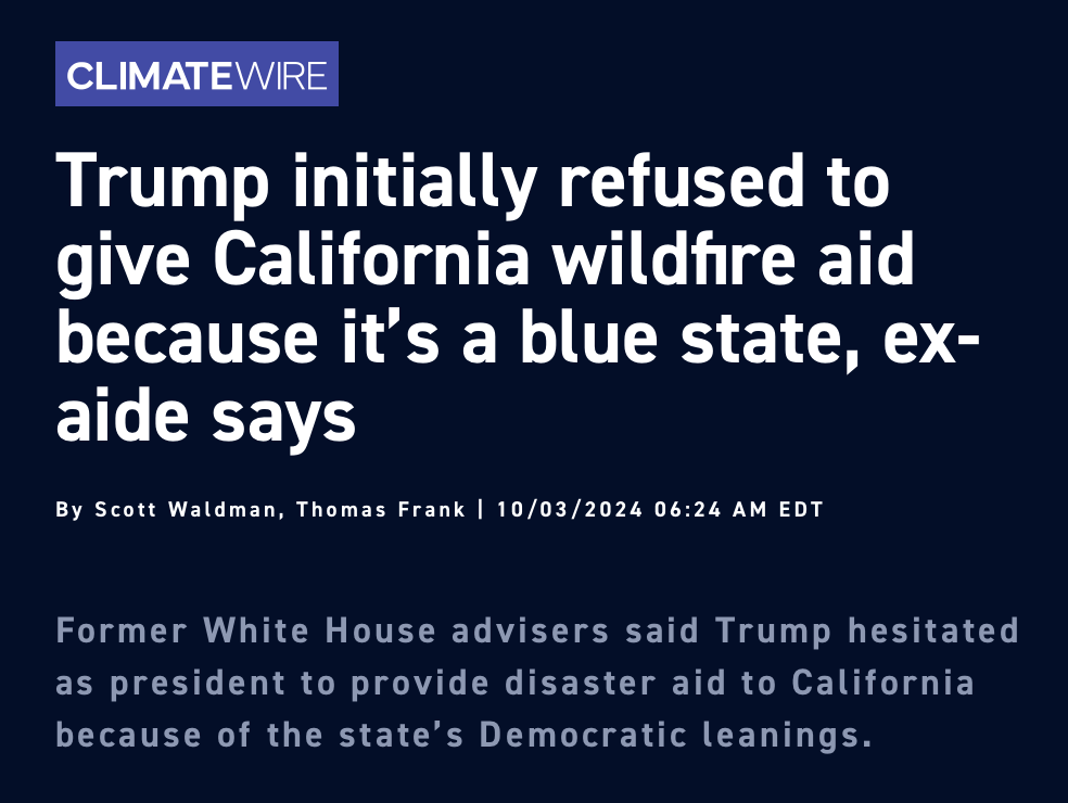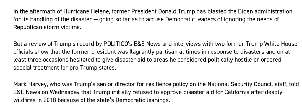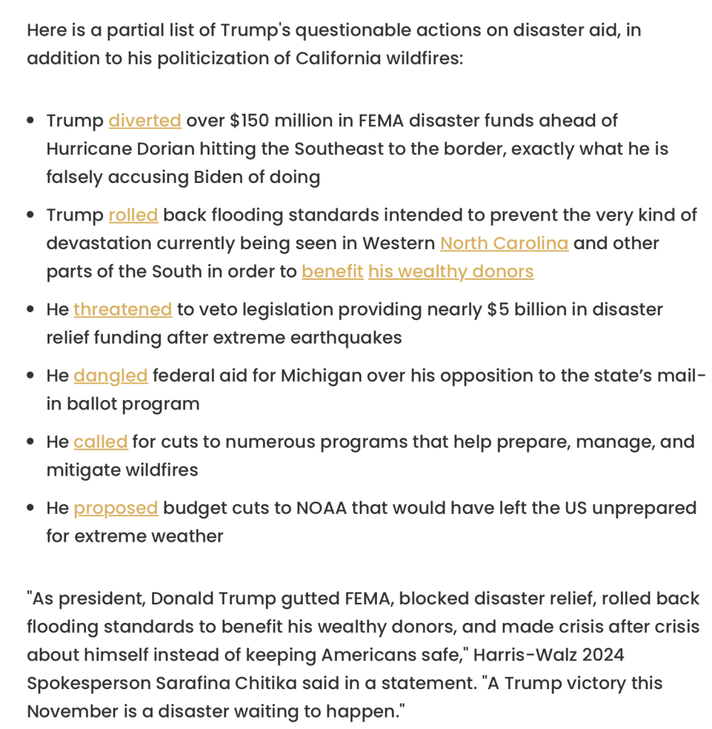 Trump has made a ton of manipulative decisions during times of crisis and natural disasters. So his accusations towards Biden/Harris as of late are blatantly hypocritical at best. Especially since Trump’s Project 2025 would have devastating impacts on hurricane victims and their recovery.