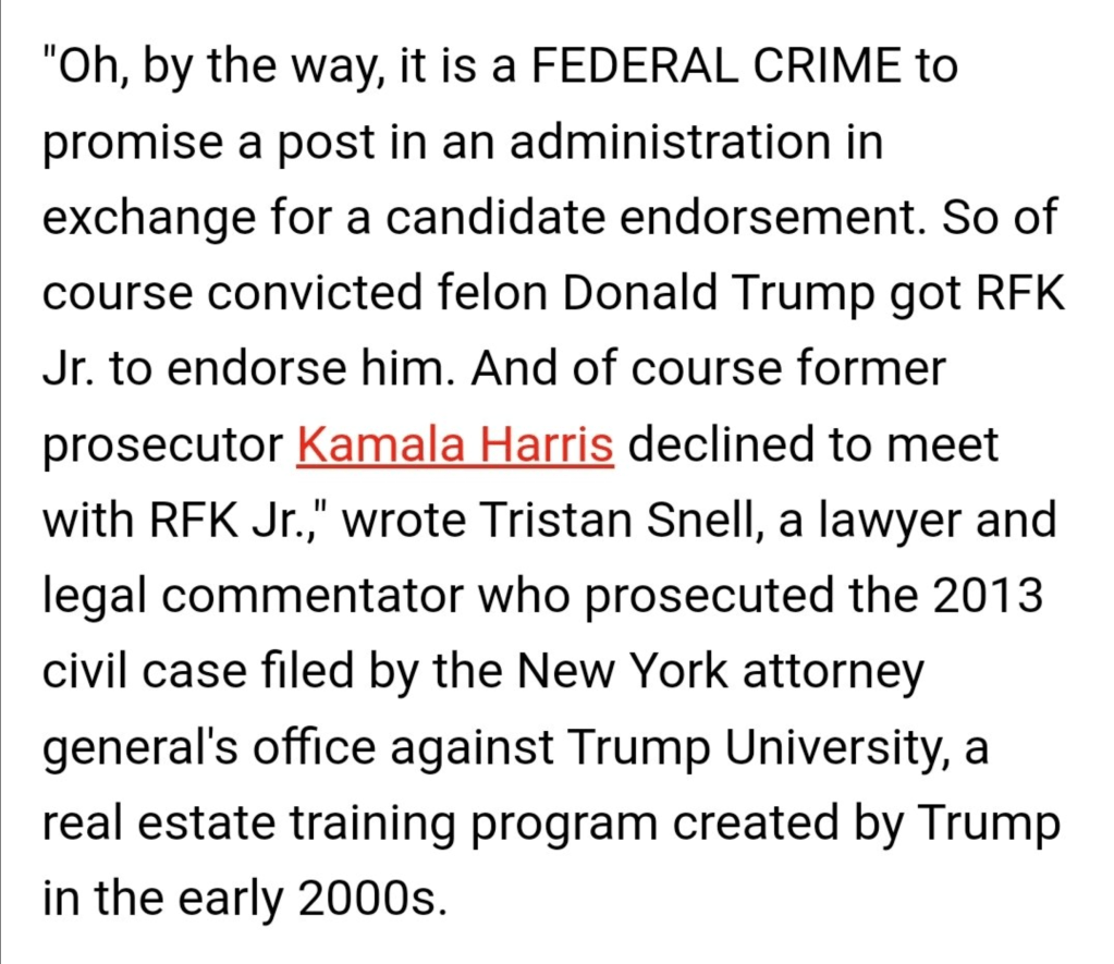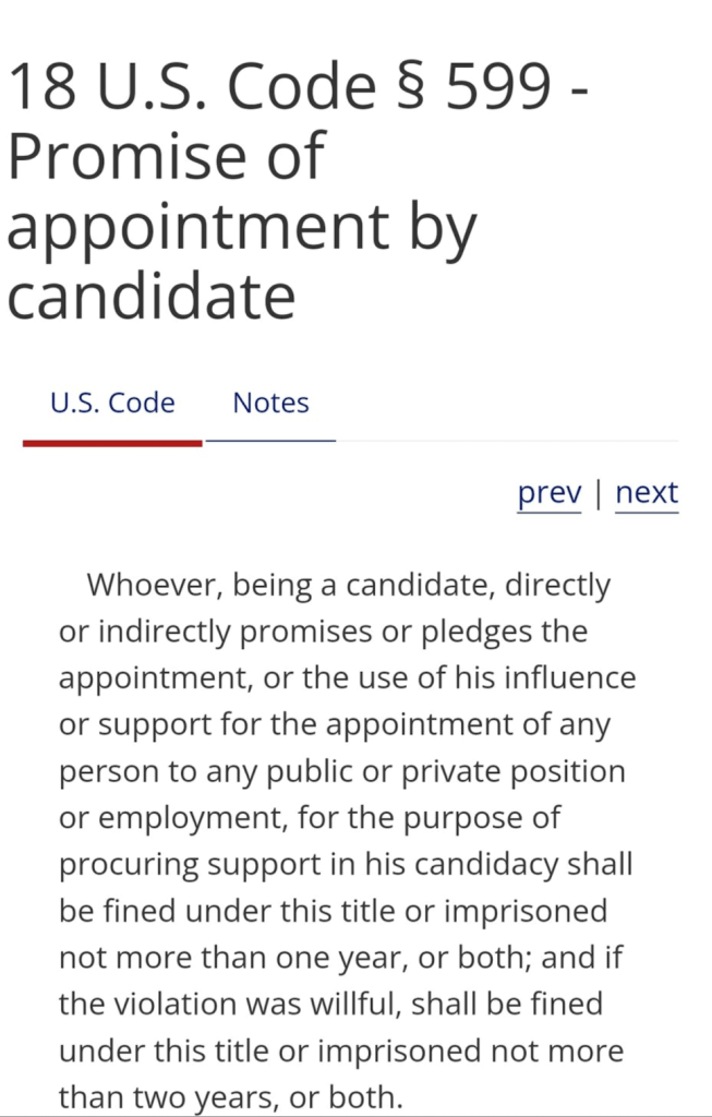 Here’s the official US Code that criminalizes such behavior. Perhaps Trump is avoiding any further legal troubles. Decided it would be easier for everyone involved to just pay $100K through his Law Firm to satisfy RFK Jr’s return for services rendered. At the very least it is something that the mainstream press should question both Trump and RFK Jr about. As campaign finance, money laundering, bribery, and extortion could all be potential laws that are being broken here.