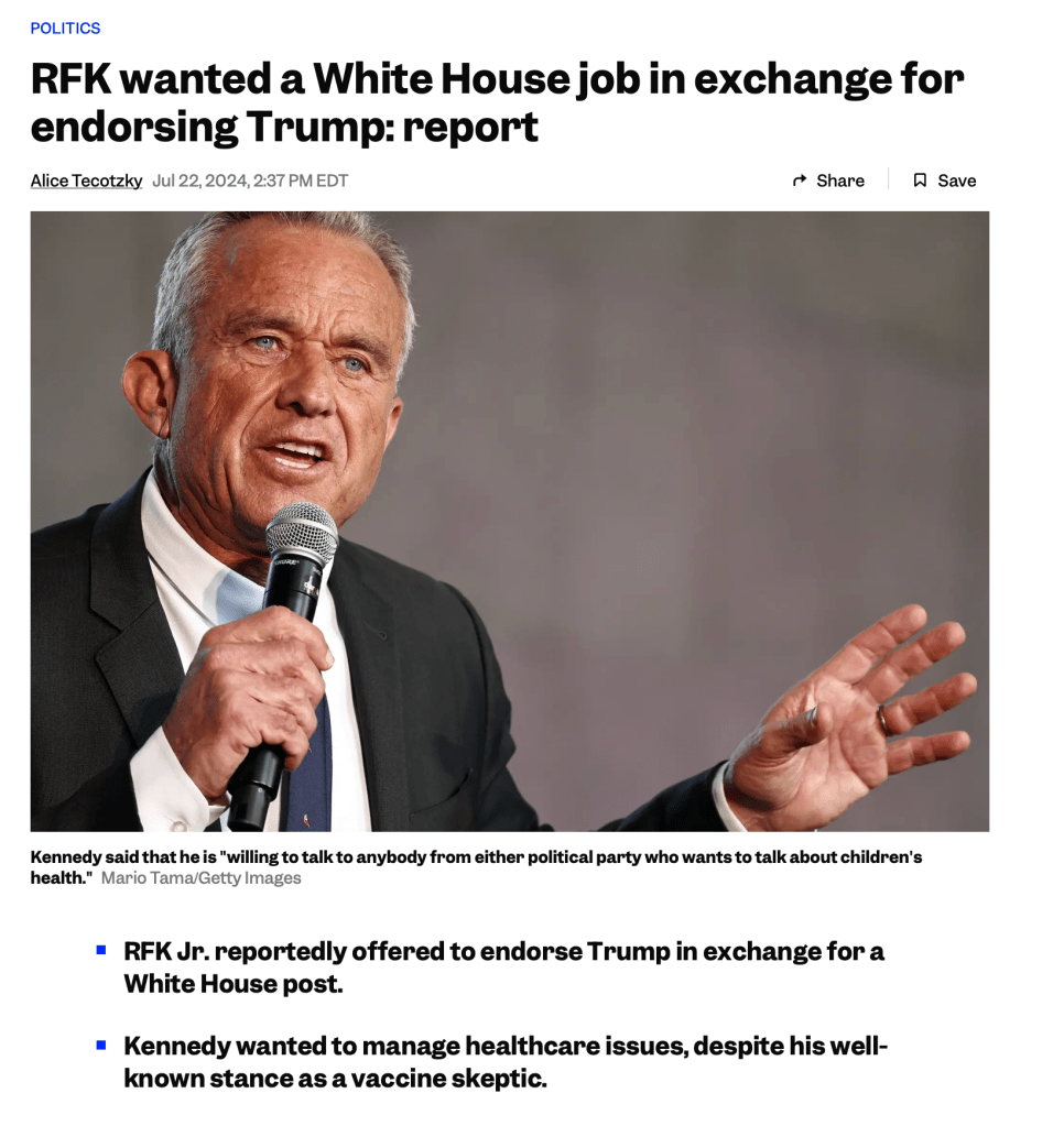 RFK Jr wanted a cushy White House gig for his endorsement and by his own admission was shopping it around to the two remaining campaigns.