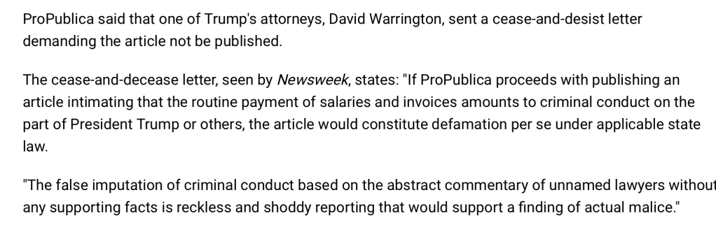 Attorney David Warrington is a longtime member of the Federalist Society and the Republican National Lawyers Association. He has been working for Trump’s campaign for some time now. Newsweek even reported it was Warrington who was tasked with sending cease and desist letters to ProPublica on behalf of the Trump campaign.